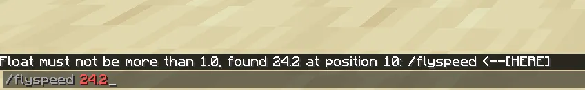 Commands.literal("flyspeed") .then(Commands.argument("speed", FloatArgumentType.floatArg(0, 1.0f)) .executes(ctx -> { float speed = ctx.getArgument("speed", float.class); /* Set player's flight speed */ return Command.SINGLE_SUCCESS; }) );Now, if we input a valid float between 0 and 1, the command would execute correctly: